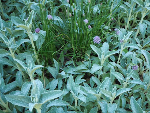 The early flowering plants like chives preside over the lambs ears just now presenting their gifts still wrapped in the bud. . . .
