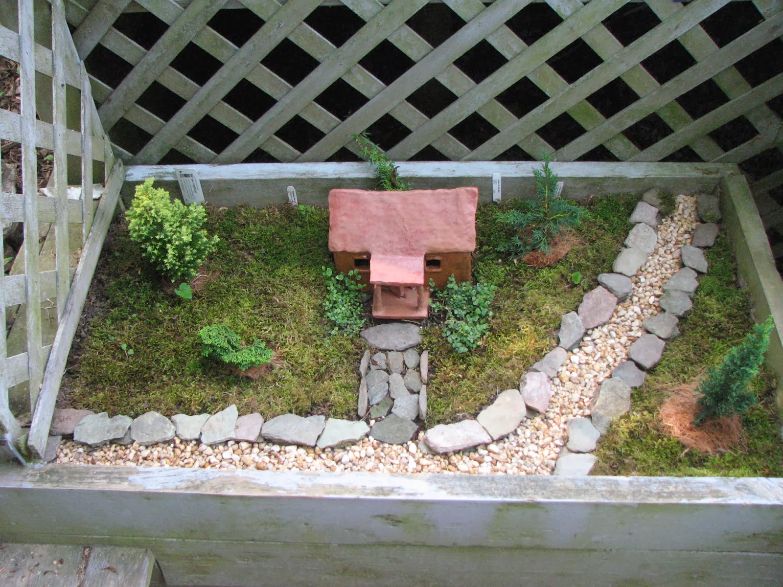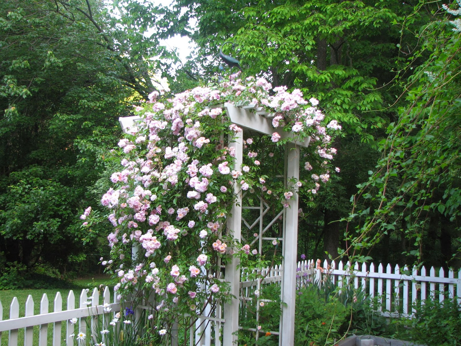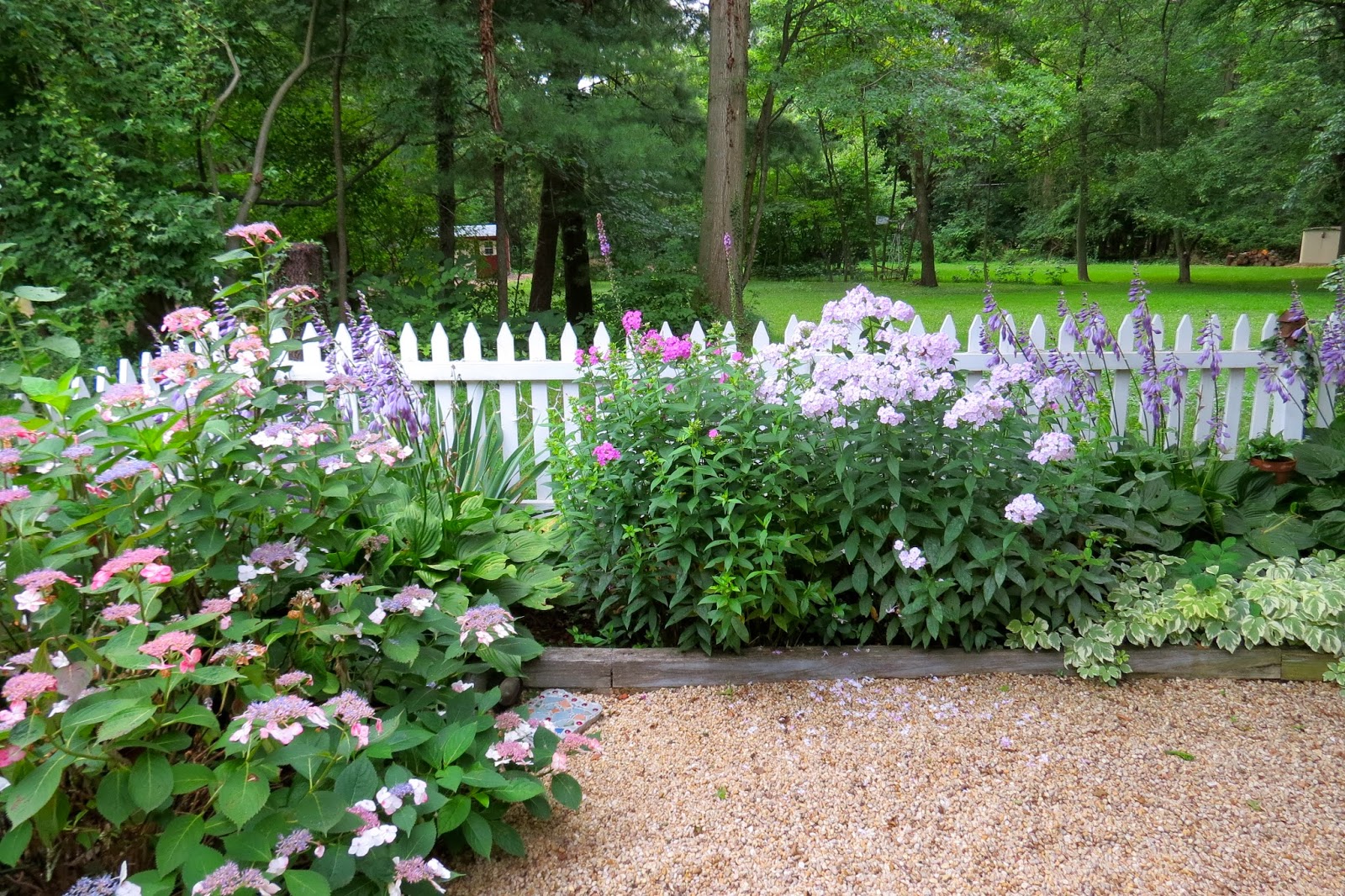 Hi Janet! The thing about garden photos is they focus on one plant or one area at a time and you get the impression the entire garden is beautiful! :-) But in reality, this collection of photographs only captures a moment in time when everything looked its best. I've been putting in gardens since 1992 and changing their look from time to time. The "yellowish material" is pea gravel. Moles kept destroying the lawn, so we decided to dig it all up a couple years ago. The wire fence was put up to keep Gabriel, my Westie, from escaping--he can't jump that high. I always wanted a house with a white picket fence around it! This house did not lend itself to that, so we enclosed the side yard when our youngest was little (he's 26 now). I have the wonderful memory of him climbing under the back gate like Peter Rabbit :-). We had to put in a board and build up the threshold to keep him in! Later we dug up all that grass and put in a raised bed garden. Years later my husband built an arbor and we added pea gravel and slate to make a patio under it. That is a miniature rose and the slate we've dug up on our property. It's part of the problem we have growing things here on Braddock Mountain.