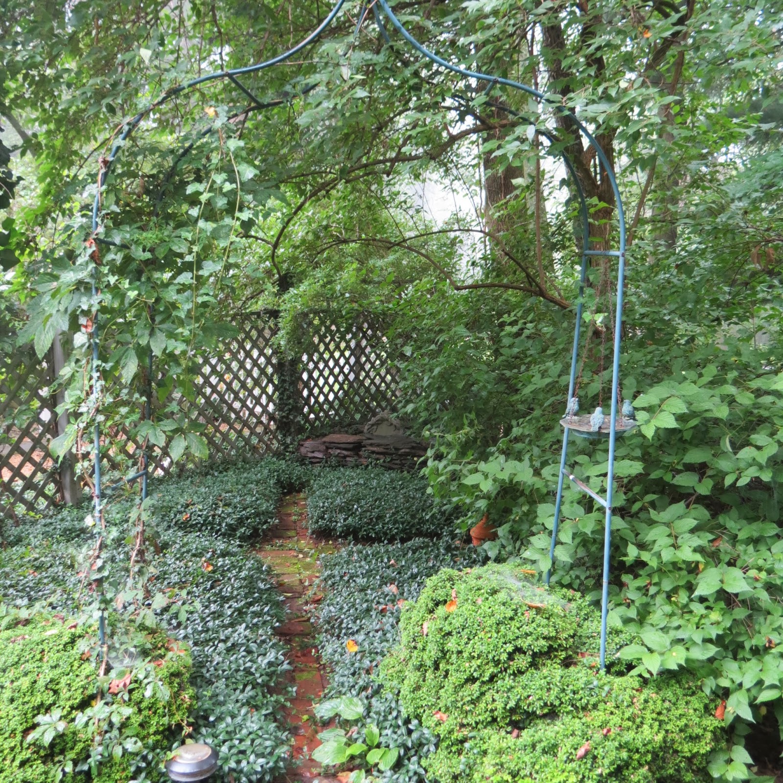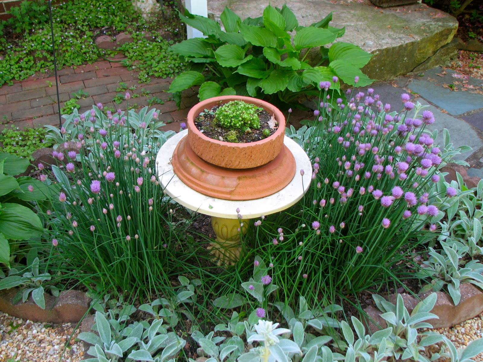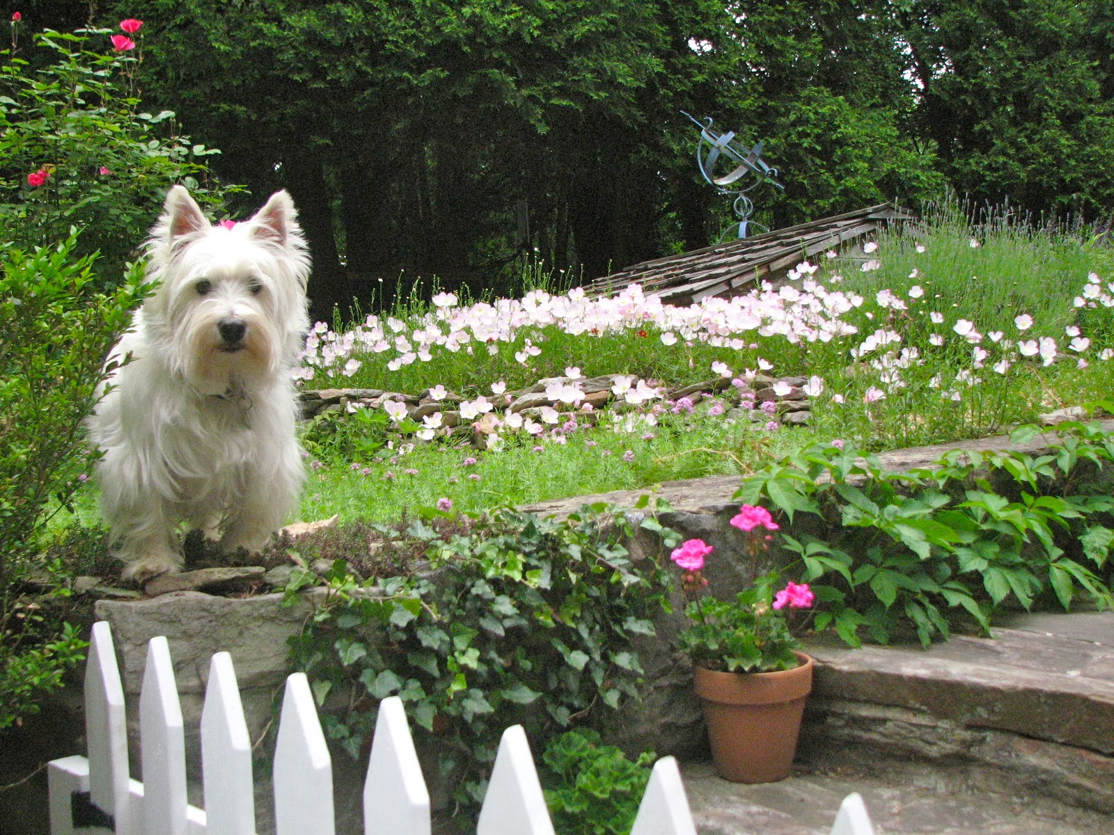 DeleteWow! You have a stunning garden, Cathy. Seriously, these photos look like ones you see in gardening books! You should DO a book. The landscape looks like it keeps you really busy but it is just beautiful. Can almost smell the lavender - my favorite. Something else I'm partial to is all the white picket fencing. And what a nice place to "go to" on this very very cold January day with nary a green thing in sight. What is the yellow-ish material on the ground under the pieces of slate [??] which are underneath what looks like a miniature rose bush in a big terracotta urn? With the white wire fence surrounding it? Almost looks like dried corn - but that can't be. Can it? Now I'm intrigued... :>)